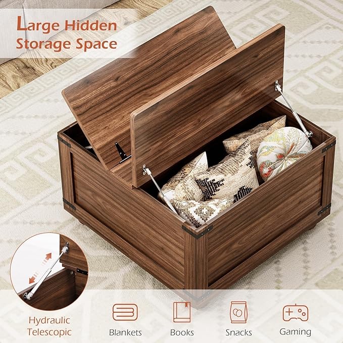 - Living Room Coffee Table with Storage : This square farmhouse coffee table with storage keeps your living room tidy and spacious. The lift-up tabletop reveals a hidden compartment for blankets, pillows, toys, and more. Overall dimensions: 31.5'' x 31.5'' x 18.9'', from small apartments to large homes