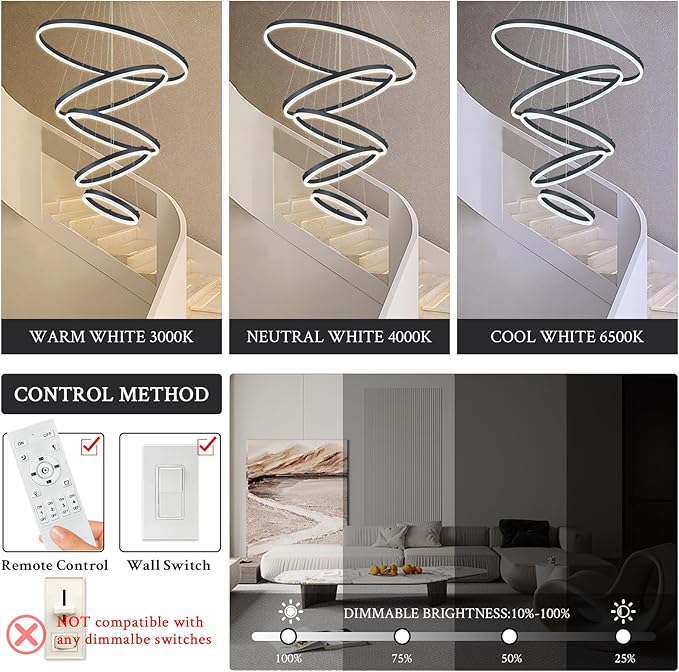 - DIMMABLE HIGH CEILING CHANDELIER: This 5-ring chandelier is dimmable, you can adjust the color temperature from 3000k warm white to 6500k cool white and choose different brightness by remote control as you like. Ideal luminous output up to 7150lm, CRI>90, 110W(Containing Light Source).