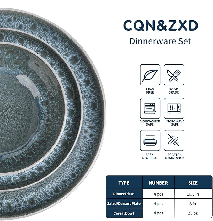 - PERFECT CHOICE AS PRESENT: CQN&ZXD ceramic dinnerware sets for 4 has flowing glaze and time-tested design, suitable for everyone, and is an ideal gift for housewarming, holidays and other celebrations.