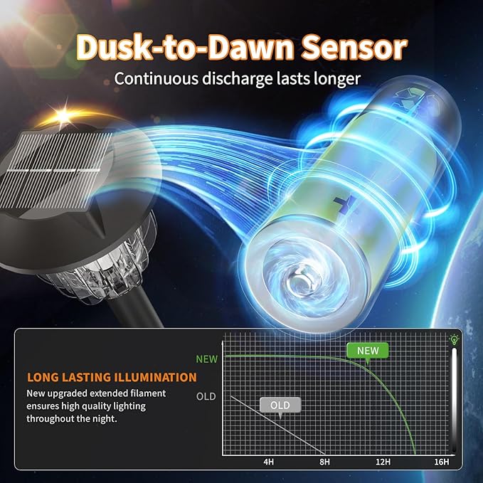 - DUSK TO DAWN LIGHT UP OUTDOOR LIGHTS: Solar powered lights automatically turn on at night and turn off at dawn which enables led pathway light conserves battery life for when it’s needed most. The solay walkway lights provide a good amount of illumination after a sunny day.
