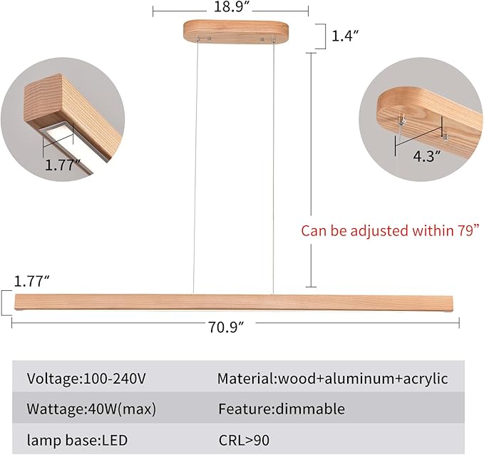 - 【Dimensions】This LED pendant kitchen island lights size:71"(L)*1.7"(W)*1.7"(H)The mounting part:12.6 x 4.3 x 1.4 inches(l*w*h) Compatible with standard junction boxes.Includes mounting hardware for vaulted,sloped ceilings.