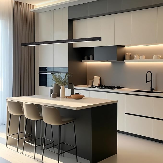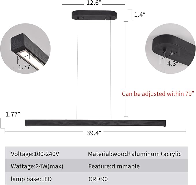 - 【Dimensions】This LED pendant kitchen island lights Color:black,size:39.4"(L)*1.7"(W)*1.7"(H),Wattage: 24W.Lumens:2000.color temperature:3000K/6000K/4000K CRI>90. Voltage: 100-240V.the mounting part:12.6 x 4.3 x 1.4 inches(l*w*h) Compatible with standard junction boxes.Includes mounting hardware for vaulted,sloped ceilings.For indoor,covered patio use.the the cable length is adjustable up to 78 inches.notice:please do not use dimming switch,dimming equipment has been configured inside the light,please use ordinary wall button switch.otherwise the light fixture may flicker.