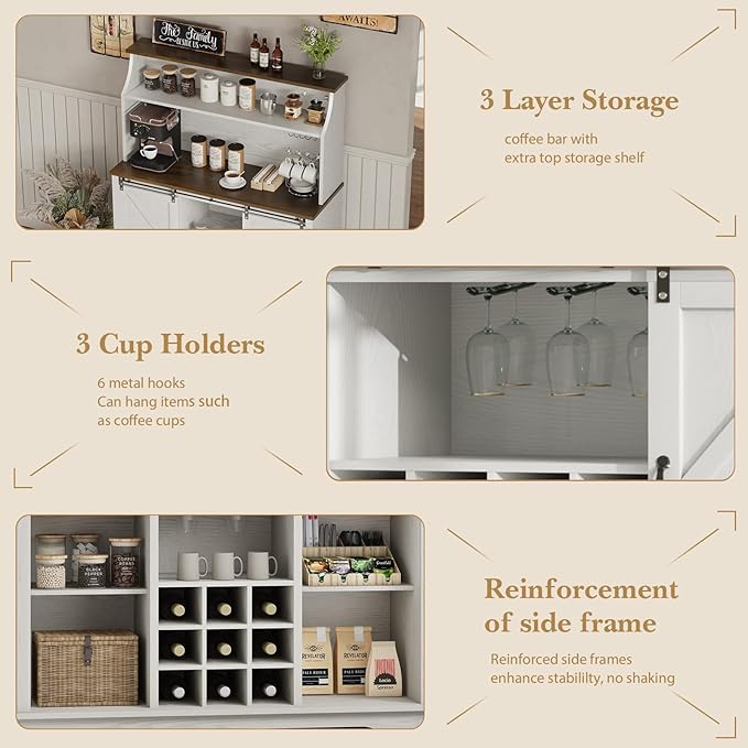 - [Classic Farmhouse Style Coffee Bar] The coffee bar features curved lines top & sliding barn door design, ideal for country/industrial style homes. It's both practical and beautiful, serving as both kitchen cabinet and living room centerpiece