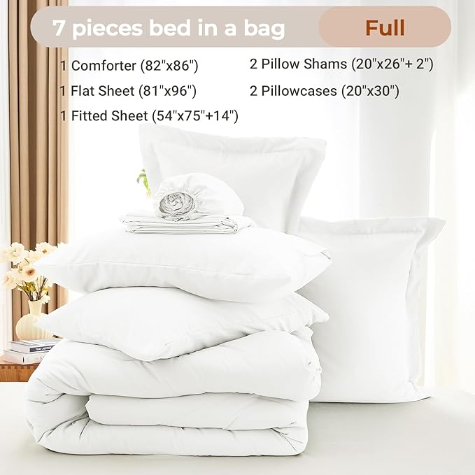 MUXHOMO 7 Pieces Full Comforter Set, Soft Bed in a Bag Full Size, All Season Bedding Set with Comforter, Flat Sheet, Fitted Sheet, Pillowcases & Shams, White
