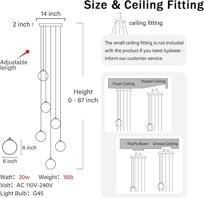 - 【Glass Chandelier Size】Chandelier ceiling plate diameter: 14 inch, Chandelier max height: 87inch.Crystal size:W 6inch * H 6inch,The chandelier weighs about 16LB.Wide voltage drive application range: AC 85-265 volts