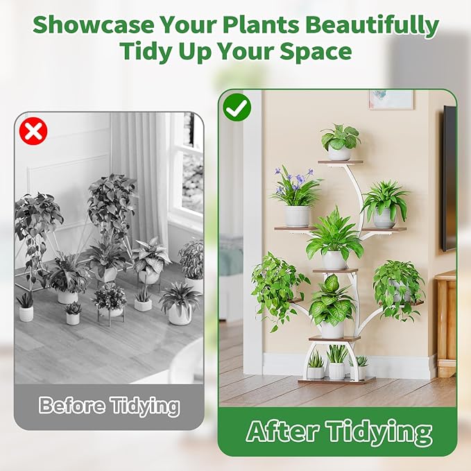 - 【Elegant Tree-Shaped Design】This plant stand indoor feature a tree-like structure, it adds a touch of nature, artistic flavor and vitality to your living room, bedroom, or porch. Boasting an six-layer shelf, this tiered plant stand efficiently utilizes vertical space, providing ample room to display your plants and completely saying goodbye to cluttered plants in the room.