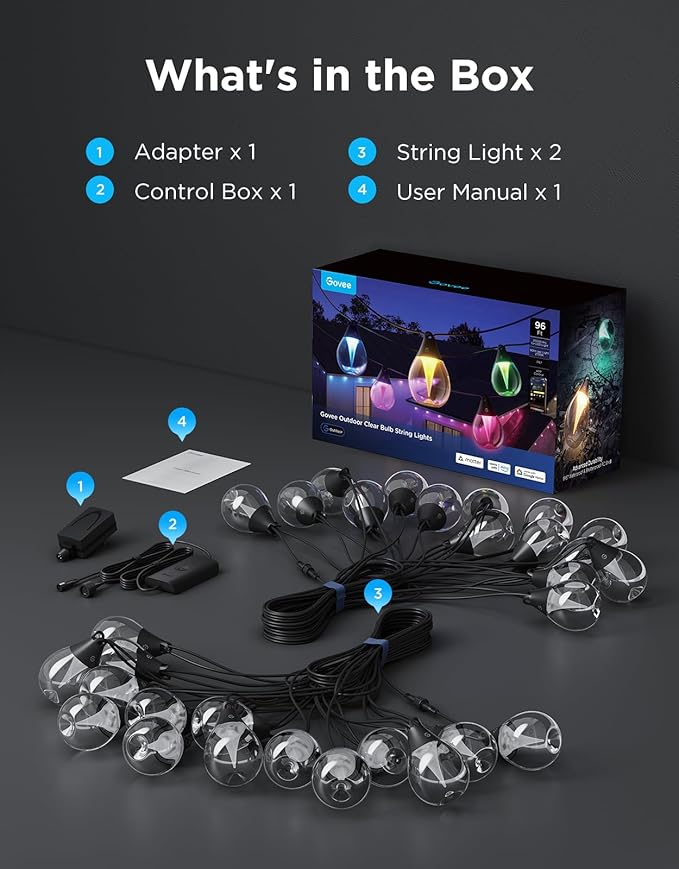- Music Sync: Turns your patio into a lively dance floor as the lights react to your favorite songs through the built-in mic, bringing them to life with stunning, dynamic lighting effects.