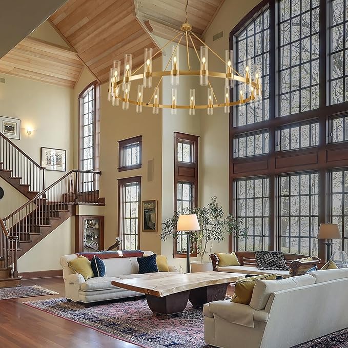 Gold Wagon Wheel Chandelier, 60 Inch Glass Chandeliers, 20 Light Chandelier for High Ceiling, Modern Farmhouse Chandeliers for Living Room, Dining Room, Entryway, Stairwell(Bulbs Included)