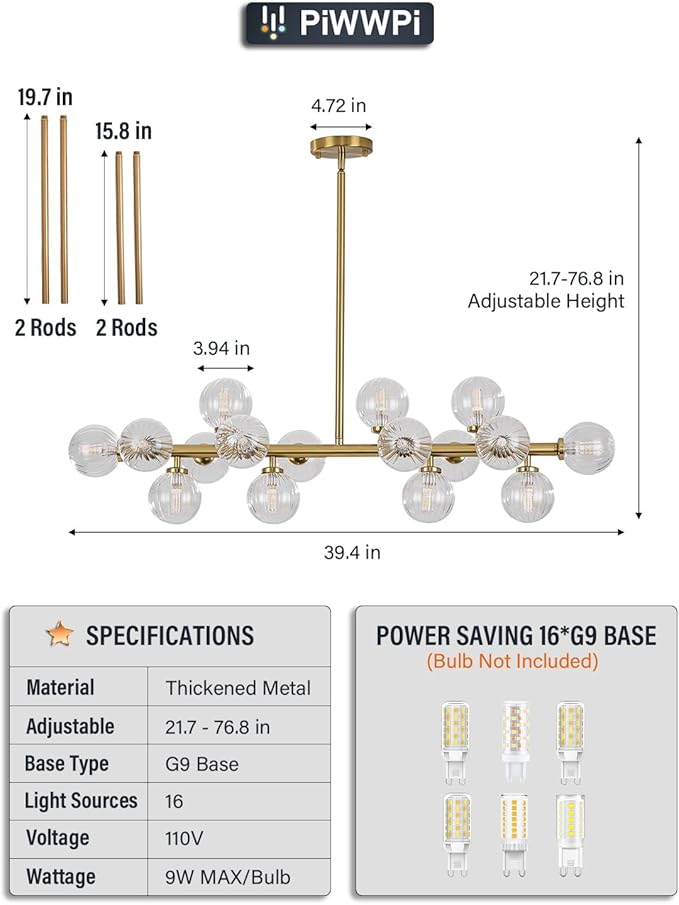 - G9 Bulbs & Dimmable: Requires 16 G9 bulbs (MAX 9W, Not Included). 3-color temperature G9 LED bulbs are recommended to create different atmospheres: Warm (2700K), Neutral (4000K), White (6000K). The globe chandelier is fully dimmable when paired with compatible dimmable bulbs and a switch (Also Not Included).