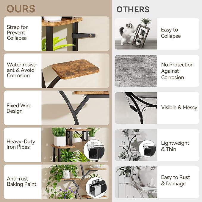 - Heavy-Duty & Rustproof - Crafted with 0.85mm thick iron pipes and reinforced with baking-paint coating, this metal plant stand resists rust and corrosion. The particleboard shelves coated with water-resistant layer to prevent warping corrosion and curling, while the wide base + furniture straps (included) ensure stability, even with kids or pets around.