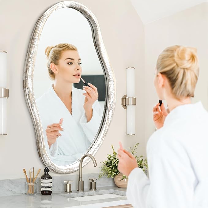 - Unique Sophisticated Design for Personalized Wall Art:Elevate your wall decor with our irregular-shaped, high-definition mirror, featuring a carefully polished mirror edge that blends modern simplicity with luxurious elegance. Crafted with a robust wooden backplane, it ensures both aesthetic appeal and long-lasting durability.