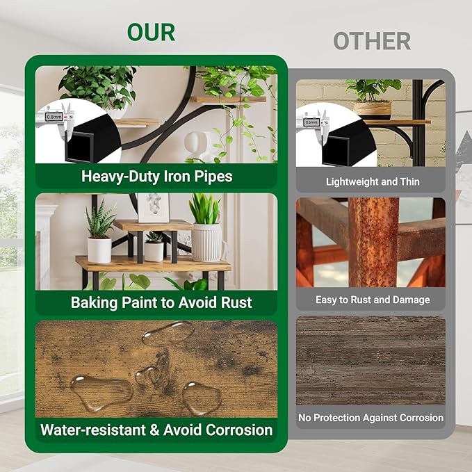 - Stable and Sturdy: Crafted from sturdy iron and particle board, our corner plant stand surpasses traditional counterparts in strength and longevity. Built to last, its robust construction ensures sturdiness. This plant stand is ideal for placement in the living room, on the patio, in a room corner, or by a window