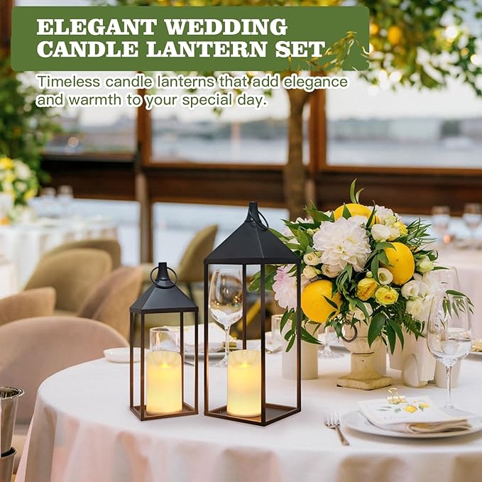 - Flameless Glow with Layered Design: These outdoor lanterns, with flameless candles, glow with a soft, warm light that replicates the inviting ambiance of natural candlelight. The 17" and 13" candle lanterns, thoughtfully paired, create a stunning visual depth when displayed together. By arranging them at varying heights, these black lanterns add a designer-inspired touch to shelves, staircases, or dining tables, enhancing any space with a cozy, flame-free glow.