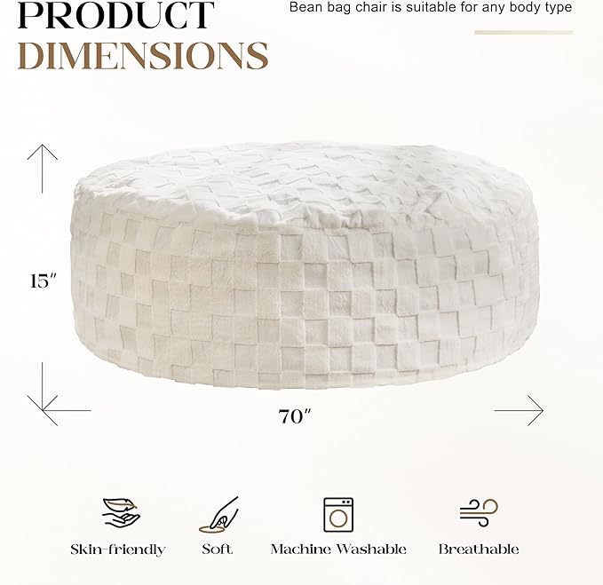 Hobestluk Bean Bag Chairs Beanbag Chair with Filler Adult Bean Bags with Fluffy Cover, Giant Bean Bag Chairs for Adults for Living Room, Bedroom (White, 6FT - 70" x 70" x 15")