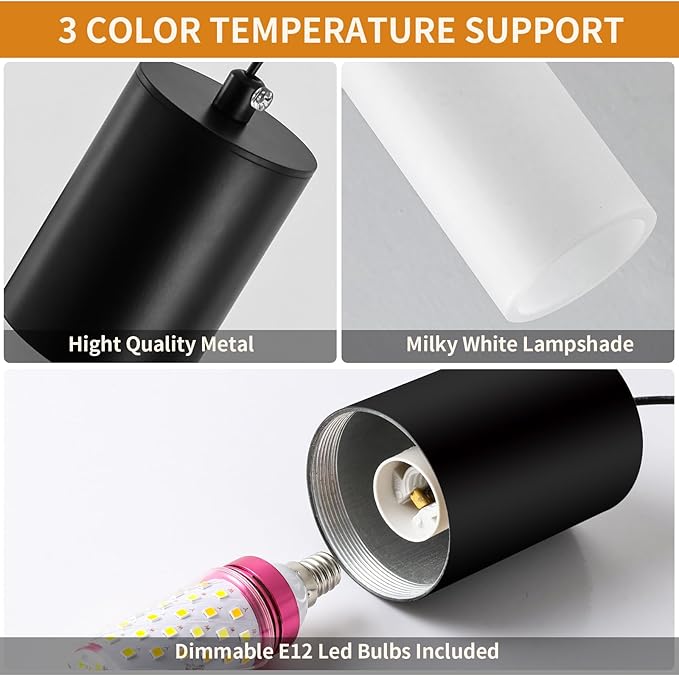 - -- Energy-Efficient LED Bulbs : Built with quality materials and energy-efficient LED bulbs (10W per bulb, E12 base) , this kitchen pendant light is not only long-lasting but also eco-friendly, saving on electricity bills while illuminating your space with optimal brightness. Bulbs can be easily replaced at any time