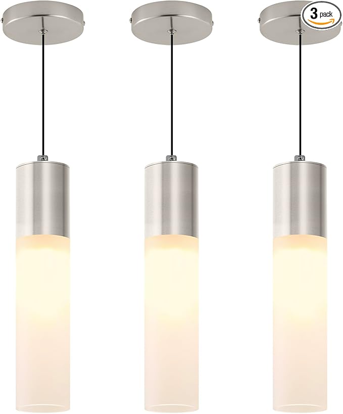 - --Multiple Applications : 3 Packs. Suitable US standard junction box. Included mounting light kits for quick installation. The brushed nickel finish and milky white cylinder lampshade of our pendant lights create a stylish and elegant atmosphere that enhances any room. Ideal for use in kitchen island,dining room, living room, Restaurant, Bedroom, Dinner Room, Balcony, passageway, Corridors, meeting room, office, bar and more