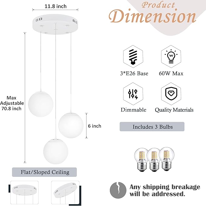 - [Modern Design Style]:This modern 3-light white globe chandelier light fixture suits multiple scenes like living rooms or modern stairwell lighting, delivering a contemporary aesthetic to elevate your space.