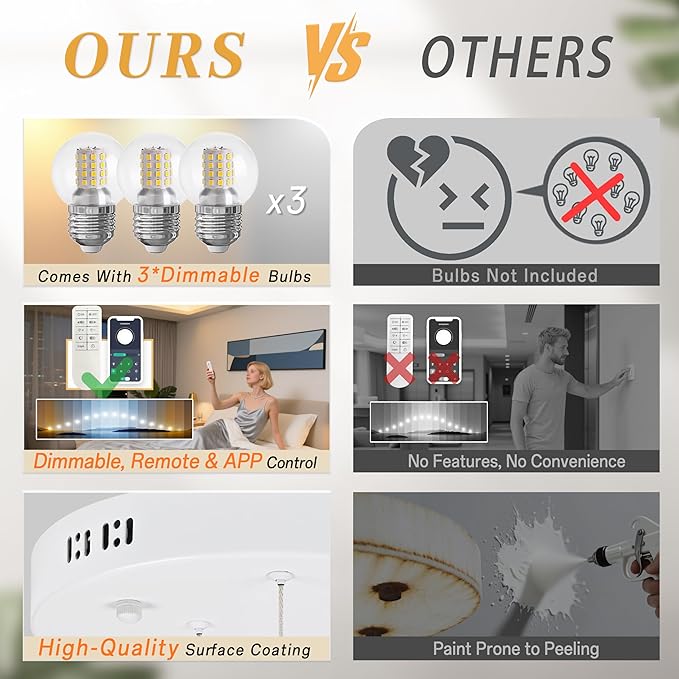 - [Bulb & Dimmable Contro]:Comes with 3 tri - color dimmable bulbs + remote (APP control supported, follow instructions). Adjust 3 light colors/temps (bright white, soft neutral, warm glow) and 0% - 100% brightness freely — Wall dimmers not compatible.