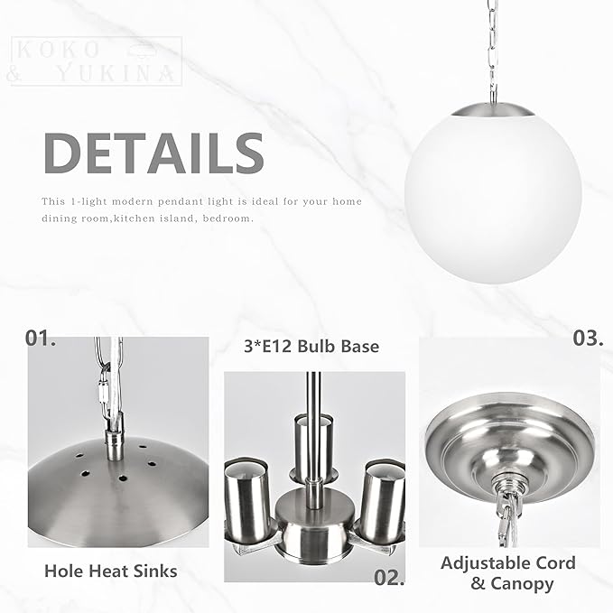 KoKo&Yukina 13.7 Inch Nickel Globe Pendant Light Adjustable Globe Pendant Lights Kitchen Island Mid Century Light Fixture with Milky White Glass Shade for Living Room