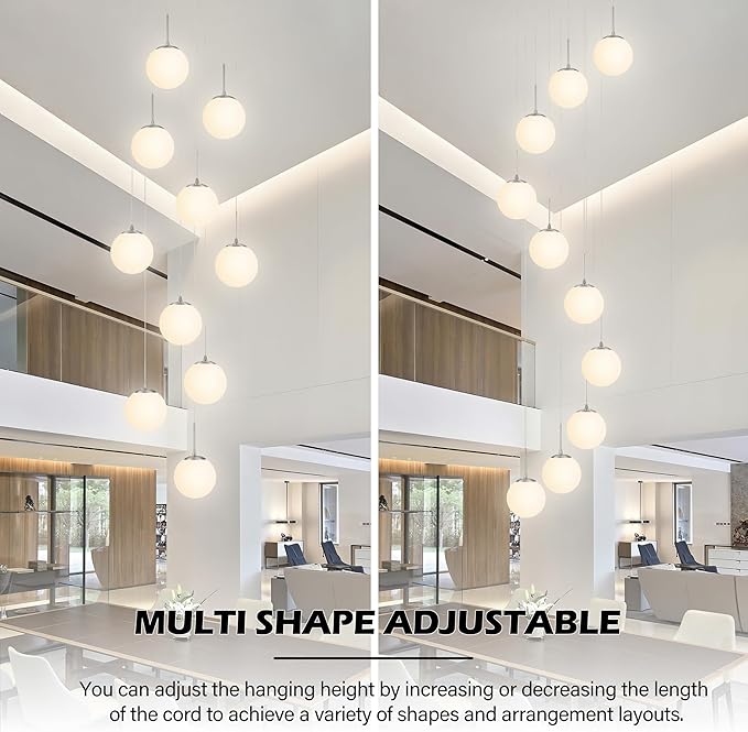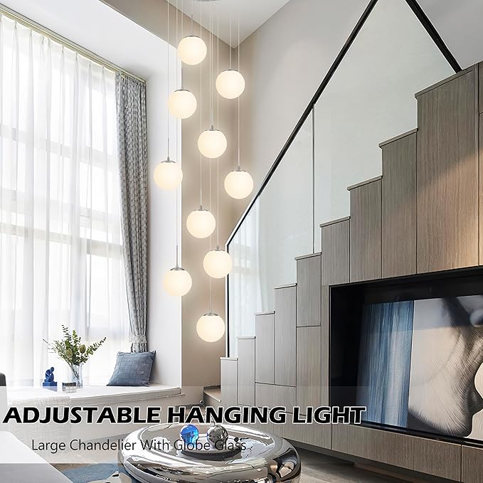 KoKo&Yukina 10 Light Globe Pendant Light Adjustable Hanging Light Staircase Chandelier Milk Glass Pendant Lights with Milky White Glass Shade Globe Lights for Staircase