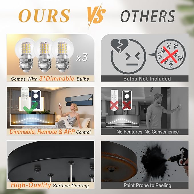 - [Bulb & Dimmable Contro]:Comes with 3 tri - color dimmable bulbs + remote (APP control supported, follow instructions). Adjust 3 light colors/temps (bright white, soft neutral, warm glow) and 0% - 100% brightness freely — Wall dimmers not compatible.