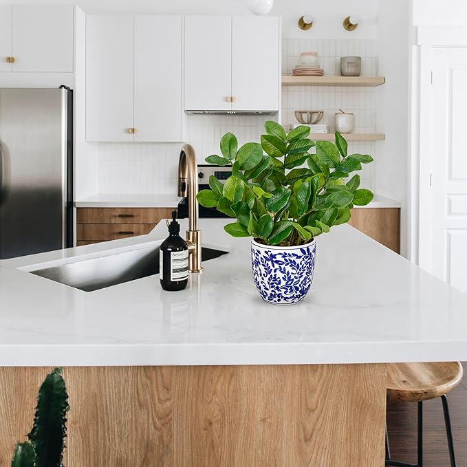 - Elegant Blue White Ceramic Pot for Stylish Display: Housed in a beautifully designed blue white ceramic pot, this faux plant indoor serves as a decorative accent or a lovely housewarming gift. The intricate floral pattern on the pot adds a touch of classic elegance, complementing the greenery while seamlessly blending with various decor styles, from traditional to modern.