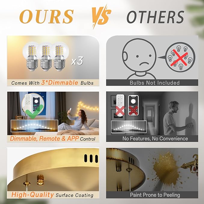 - [Dimmable & Smart Control]: 3 custom tri - color bulbs enable 0% - 100% brightness dimming, working with remote/APP (follow instructions). For color inconsistency, reinsert bulbs and keep lit for ≥15 mins — bulbs “memorize” the uniform hue. (Wall Dimmers Not Supported)