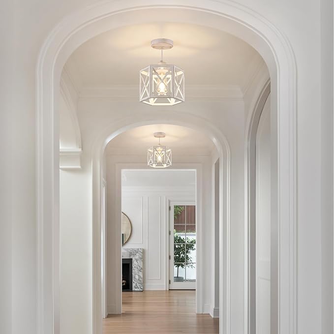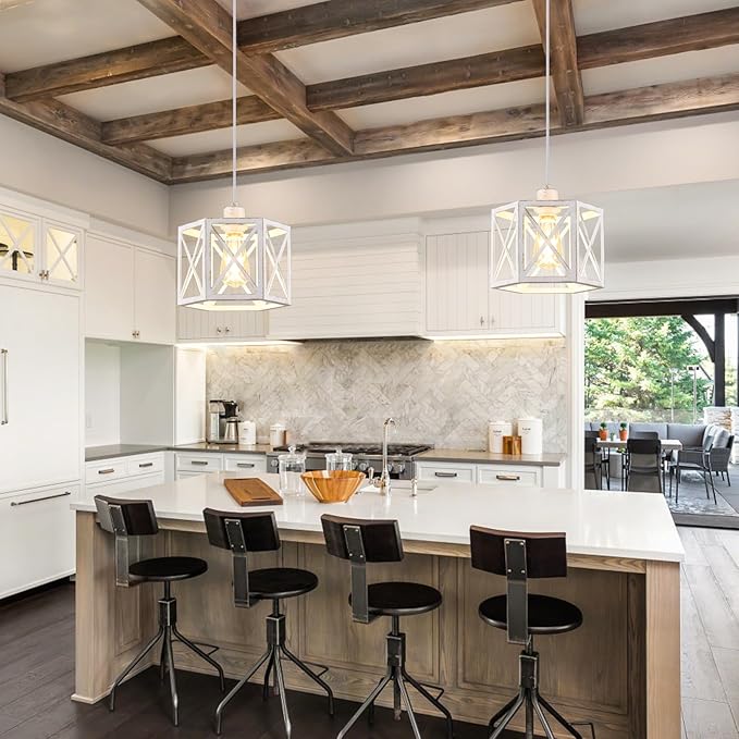 - 【Retro Style】Illuminate your space with this elegant 2-pack white pendant lights, featuring a hexagonal metal cage design in a antique white finish that emits a soft, diffused glow,perfect for creating a warm, vintage ambiance in modern farmhouse interiors while adding subtle geometric sophistication to kitchens, dining rooms, or entryways.