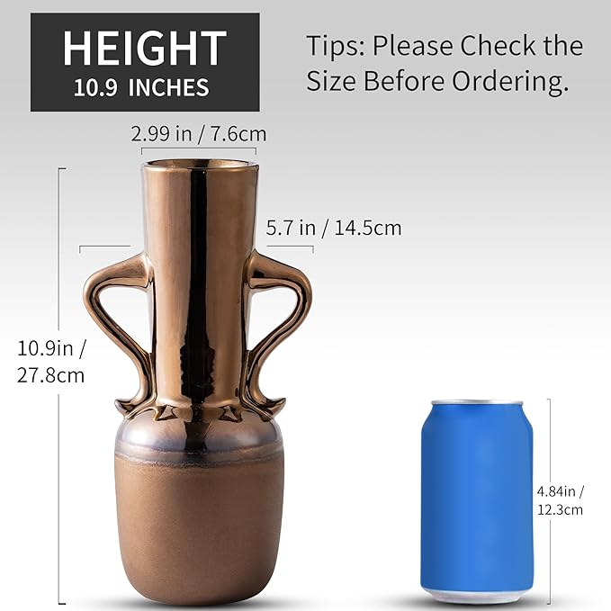 - Handmade Ceramic Vase with Elegant Metal Glaze: This artisan-crafted ceramic vase features a stunning metallic glaze in warm gold, amber, and brown tones, creating a luxurious vintage aesthetic. The two handles add a classic touch, making this rustic farmhouse vase perfect as a centerpiece or decorative accent. Each piece is uniquely hand-finished, showcasing the beauty of handmade ceramics.