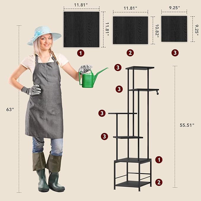 - [Spacious 6 Tiers] This tiered plant stand offers six levels of storage, allowing you to showcase a variety of plants in different heights and styles. The bottom tier features a protective railing to secure pots, while the middle tier includes a side plant holder hook, perfect for hanging baskets. Whether you’re decorating a plant rack indoor or adding greenery to a cozy corner, this stand provides ample space without taking up too much room, making it a must-have for corner plant stands for indoor plants