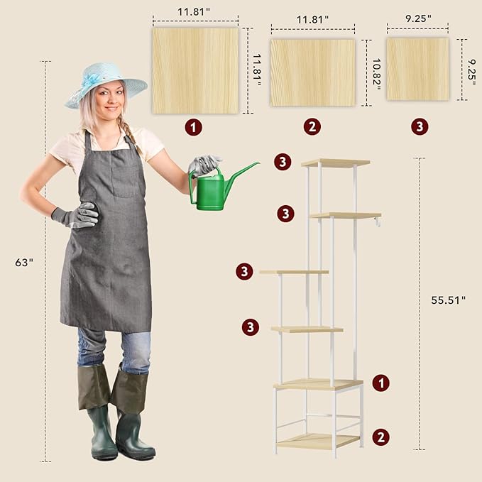 - [Spacious 6 Tiers] This tiered plant stand offers six levels of storage, allowing you to showcase a variety of plants in different heights and styles. The bottom tier features a protective railing to secure pots, while the middle tier includes a side plant holder hook, perfect for hanging baskets. Whether you’re decorating a plant rack indoor or adding greenery to a cozy corner, this stand provides ample space without taking up too much room, making it a must-have for corner plant stands for indoor plants
