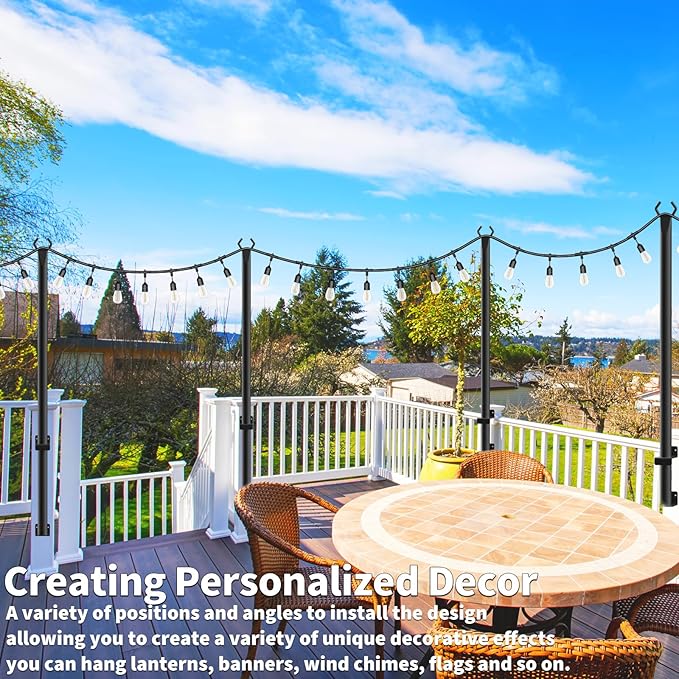 - No height restrictions:Made of high quality metal, it will not bend or wobble. The poles for string lights is not limited by its own length, and the excellent load-bearing properties allow you to install it on high fences and walls. Get rid of the general height limitation. You can also hang more number of strings of lights. Also can be applied to banners, lanterns, wind chimes, all kinds of light decoration, etc.