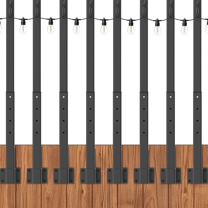 - No height restrictions:Made of high quality metal, it will not bend or wobble. The poles for string lights is not limited by its own length, and the excellent load-bearing properties allow you to install it on high fences and walls. Get rid of the general height limitation. You can also hang more number of strings of lights. Also can be applied to banners, lanterns, wind chimes, all kinds of light decoration, etc.