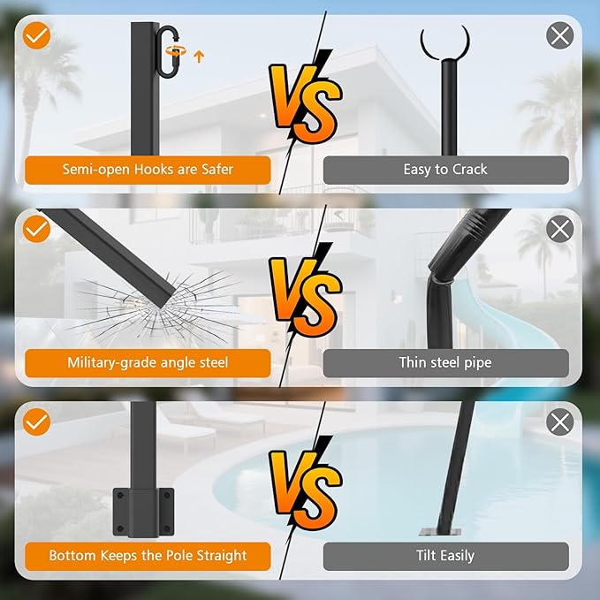 - No height restrictions:Made of high quality metal, it will not bend or wobble. The poles for string lights is not limited by its own length, and the excellent load-bearing properties allow you to install it on high fences and walls. Get rid of the general height limitation. You can also hang more number of strings of lights. Also can be applied to banners, lanterns, wind chimes, all kinds of light decoration, etc.