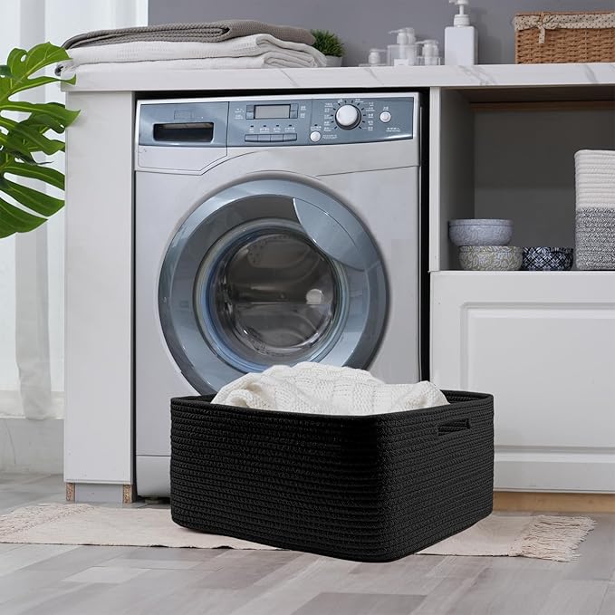 COMFY-HOMI 2 pcs Large Storage Baskets for Shelves, Laundry Basket, Woven Rope Basket, Closet Organizer Bins for Clothes Blanket Towels, Baby Nursery, Gift Toy Baskets, 17” x 13” x 7.5”-black