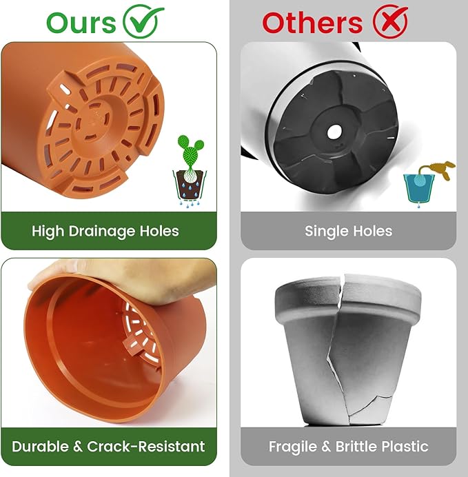 - [Drainage System Designed for Healthy Roots] These 6 inch plant pots feature multiple drainage holes at the bottom to promote airflow and prevent waterlogging. Matching saucers help catch excess water and reduce mess, making them ideal plant pots with drainage for both indoor and outdoor use.