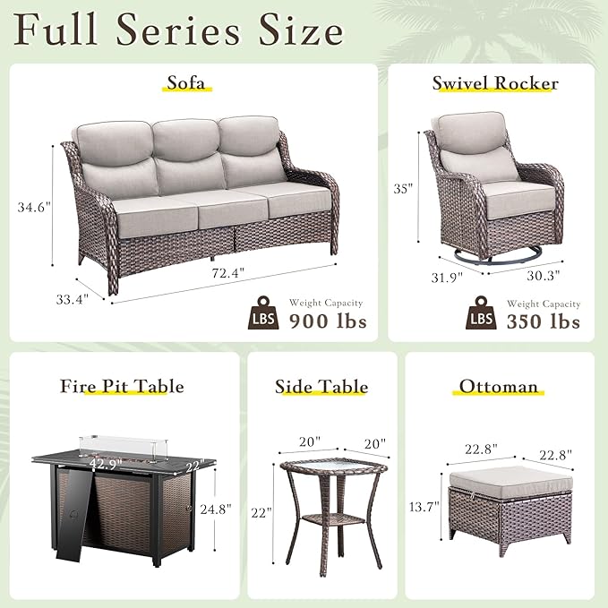 - 【Patio Set with Fire Pit Table】7 PCS Patio Furniture Set includes: 2 swivel patio chairs + 1 sofa + 2 ottoman + 1 side table + a 43" rectangle fire pit table. From compact patio setups to large poolside patio or yard, our outdoor furniture adapts to any space to create comfort and cohesive leisure areas.