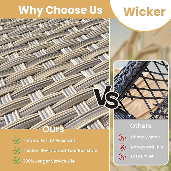 - All Weather & Durable: Selected anti-ageing treated thicken PE wicker rattan for UV resistant, wear resistant and all weatherproof. 3D strengthen and widen design for extended service life,twice service life as others