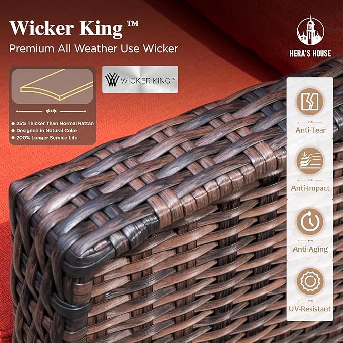 - 【All Weather Resistant Material】The outdoor patio furniture is crafted with high-quality, handwoven weather-resistant PE rattan. All cushion covers are made by CUSHION PRO technology to withstand any weather condition like rain, moisture, or intense sun exposure and can be easily removed with the zipper design. Anti soiling, waterproof, easy to maintain, UV resistant. Perfectly for year-round outdoor use