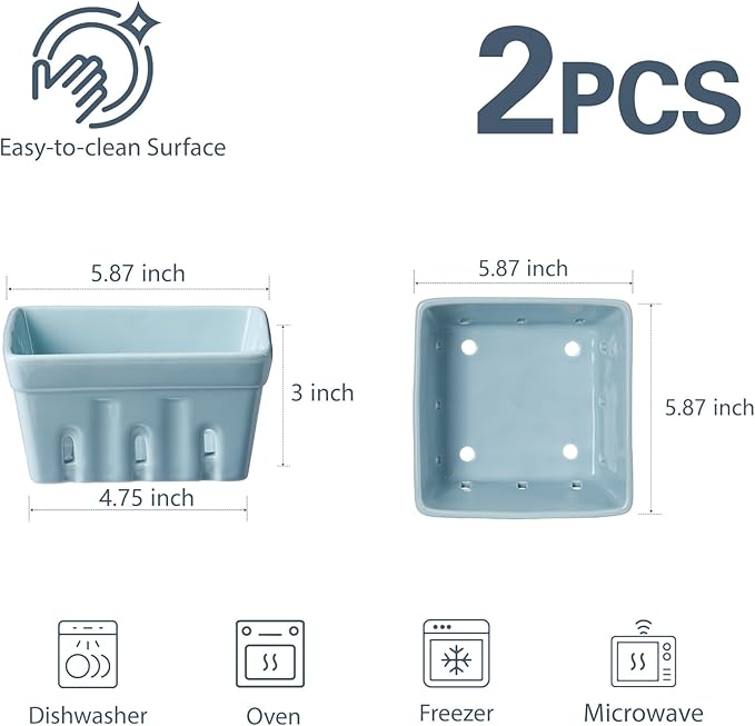 ONEMORE Berry Basket Ceramic Berry Bowls with Holes Square Fruit Bowl Berry Colander Containers for Fridge - 5.8" Fruit Basket for Kitchen Décor, Set of 2, Blue