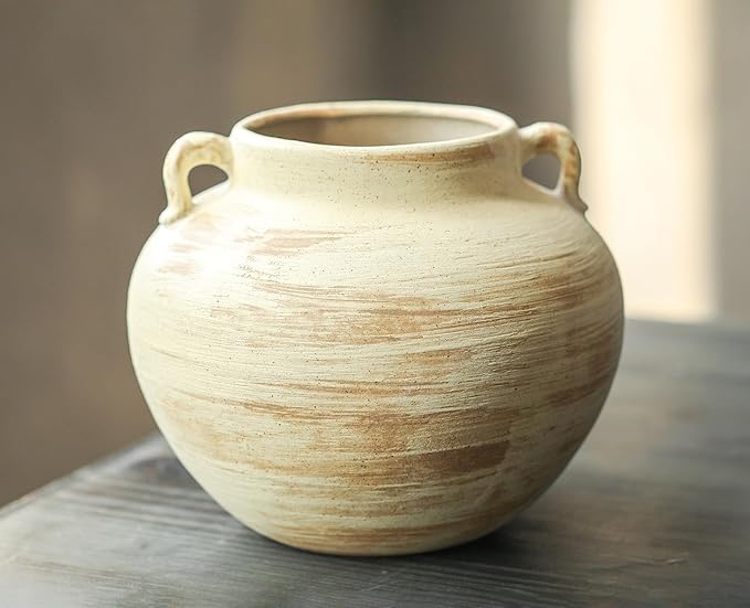 Handmade Beige White Two-Ear Ceramic Vase, Textured Pottery Vase with Two Ears for Centerpieces, Kitchen, Living Room, Bedroom Decor Gifts (Beige White, Short)