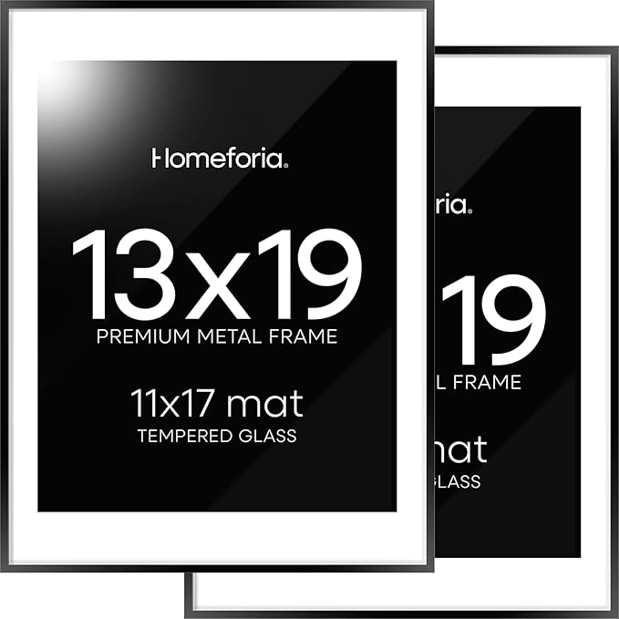 Homeforia 13x19 Picture Frame Black, High End Metal 13 x 19 Poster Frames with Mat 11 x 17 for Photo, 13x19 Black Frame Matted to 11x17 inch Print, 19x13 Thin Frame, Tempered Glass, Wall Kit, Set of 2