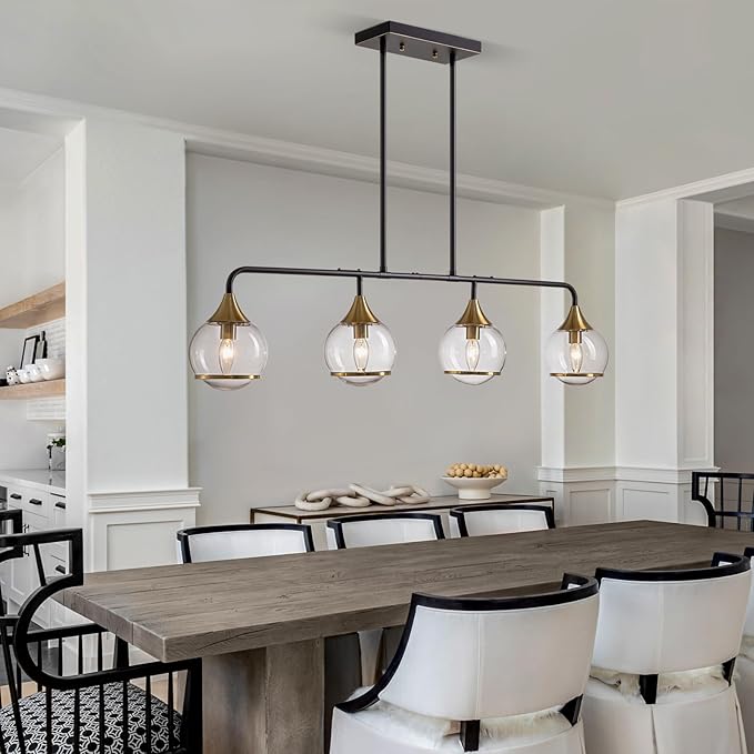 - Rustic Industrial Elegance: This stunning kitchen chandeliers over table blends a vintage farmhouse aesthetic with modern functionality. Measuring 43.3" long and adjustable up to 38.1" tall, its transparent glass shades and gold-and-black metal frame create a captivating focal point for any space.