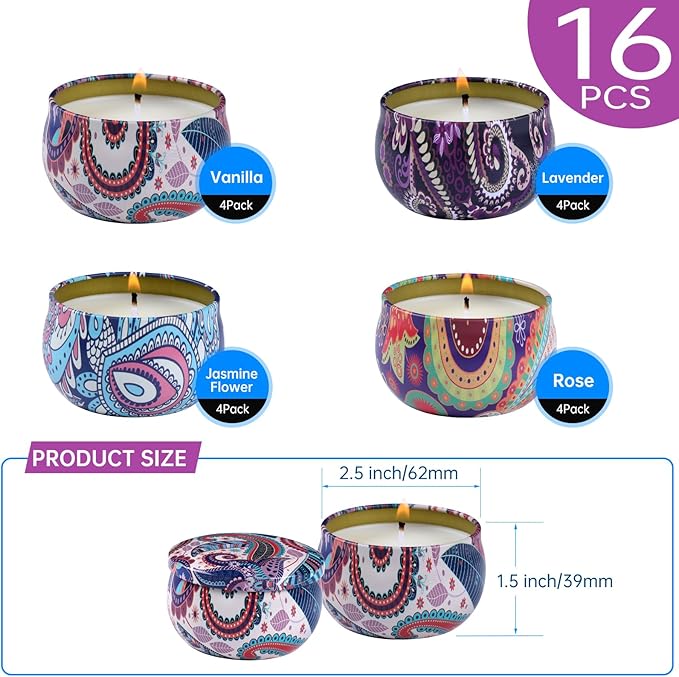 kedtui Scented Candles Gift Set, 16 Pack Aromatherapy Candle, Natural Soy Wax Travel Tin Candles for Home Scented, Ideal for Christmas, Birthday, Thanksgiving, Valentines Day Gifts