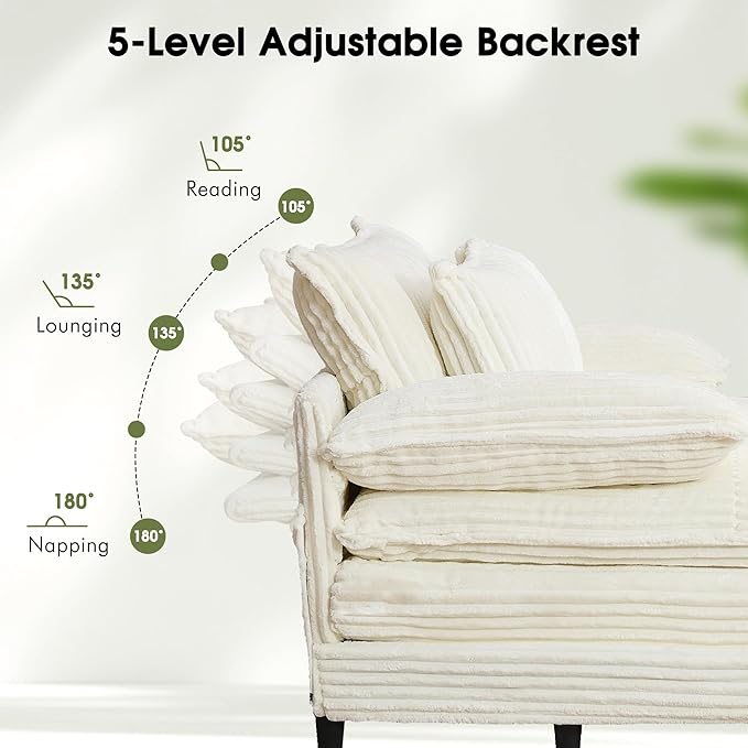 - 【Adjustable Backrest】The oversized chaise lounge sofa features a 5-position adjustable backrest (90°–180°), allowing you to switch easily between sitting upright for work, reclining for reading or gaming, and laying completely flat. Its 59" deep seat offers generous legroom and full-body support.