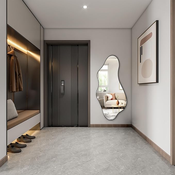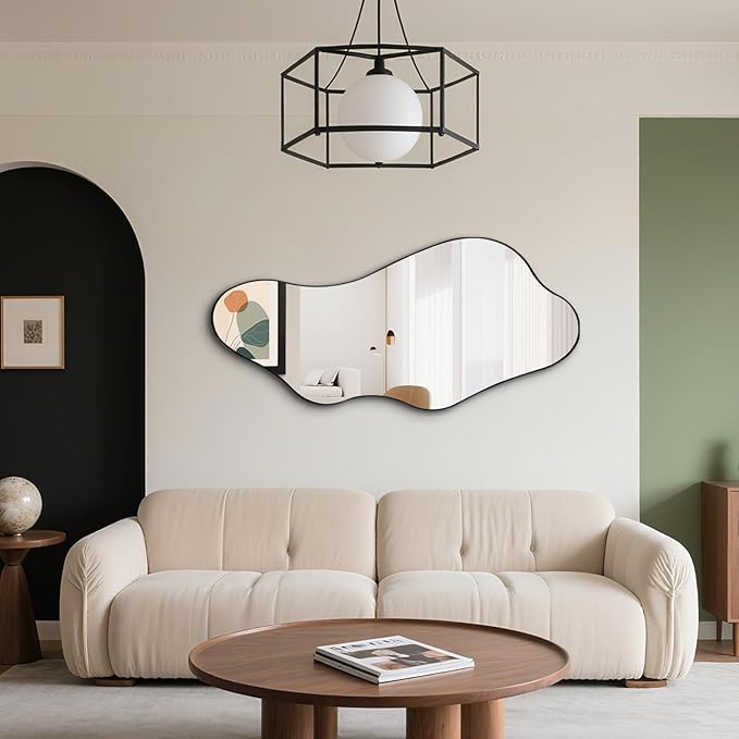 - Various Size: Irregular shaped mirror are available in 40"x18", 47"x22", 55"x25.6", 63"x30". This asymmetrical mirrors frame is made of iron. It is both practical and fashionable