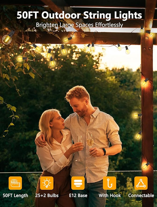 - 【50ft Connectable LED String Lights】The Kivonfa outdoor string lights set includes 25 G40 LED bulbs & 2 spare bulbs, perfect for illuminating your entire yard. The patio lights feature a hassle-free plug-and-play design that lets you connect up to 28 strands with total ease! Install like a pro in just 10 minutes, no tangled wires to hassle with.