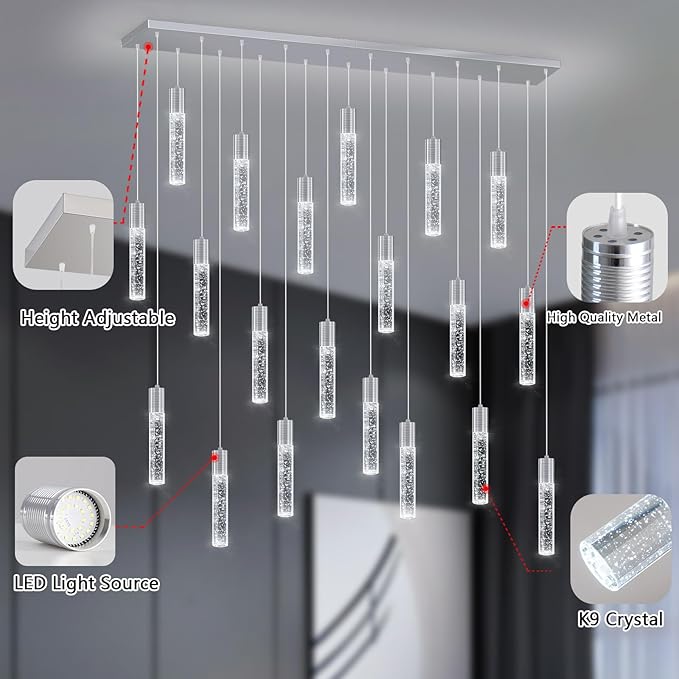 - 【K9 bubble crystal pendants】High quality aluminum lampshade with chrome finished rectangular base. Provide bright lighting and modern design looking for your kitchen, island, dining room, living room, bedroom, hallway, bar, over dining table