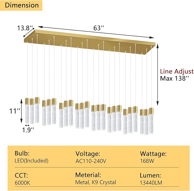 - 【K9 bubble crystal pendants】High quality aluminum lampshade with gold finished rectangular base. Provide bright lighting and modern design looking for your kitchen, island, dining room, living room, bedroom, hallway, bar, over dining table