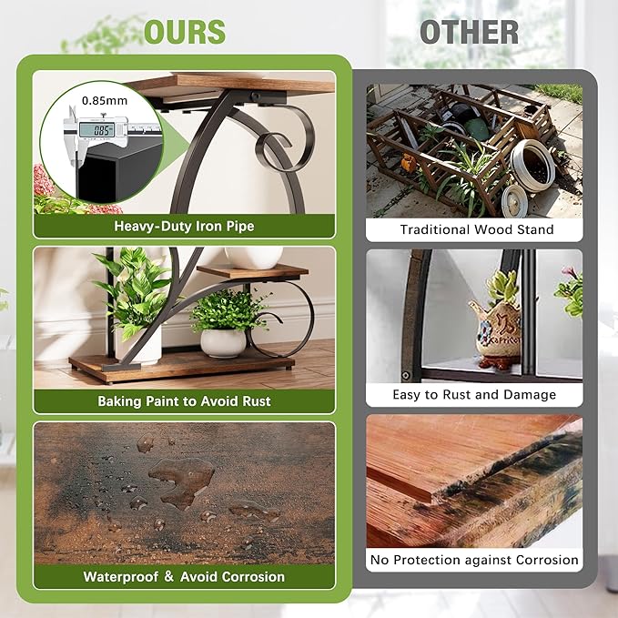 - 【Sturdy Metal Construction】Crafted with a heavy-duty iron frame, this metal plant stand offers excellent stability and long-lasting durability. Rust-resistant coated pipes and waterproof particle board ensure easy cleaning and prevent warping, seepage, or peeling over time.